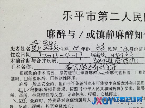 在家屬向記者提供的樂平市第二人民醫(yī)院麻醉知情同意書和手術知情同意書復印件當中,分別有戴勝亮和妻子劉雪梅的簽名,對于手術名稱的描述當中,右字有改動的痕跡。那么究竟是否做過改動,記者找到醫(yī)院方面進行核實。樂平市第二人民醫(yī)院副院長張學林表示,這個應該不是涂改的痕跡。“是寫得右下肢啦,重寫有可能,涂改可能不是。”